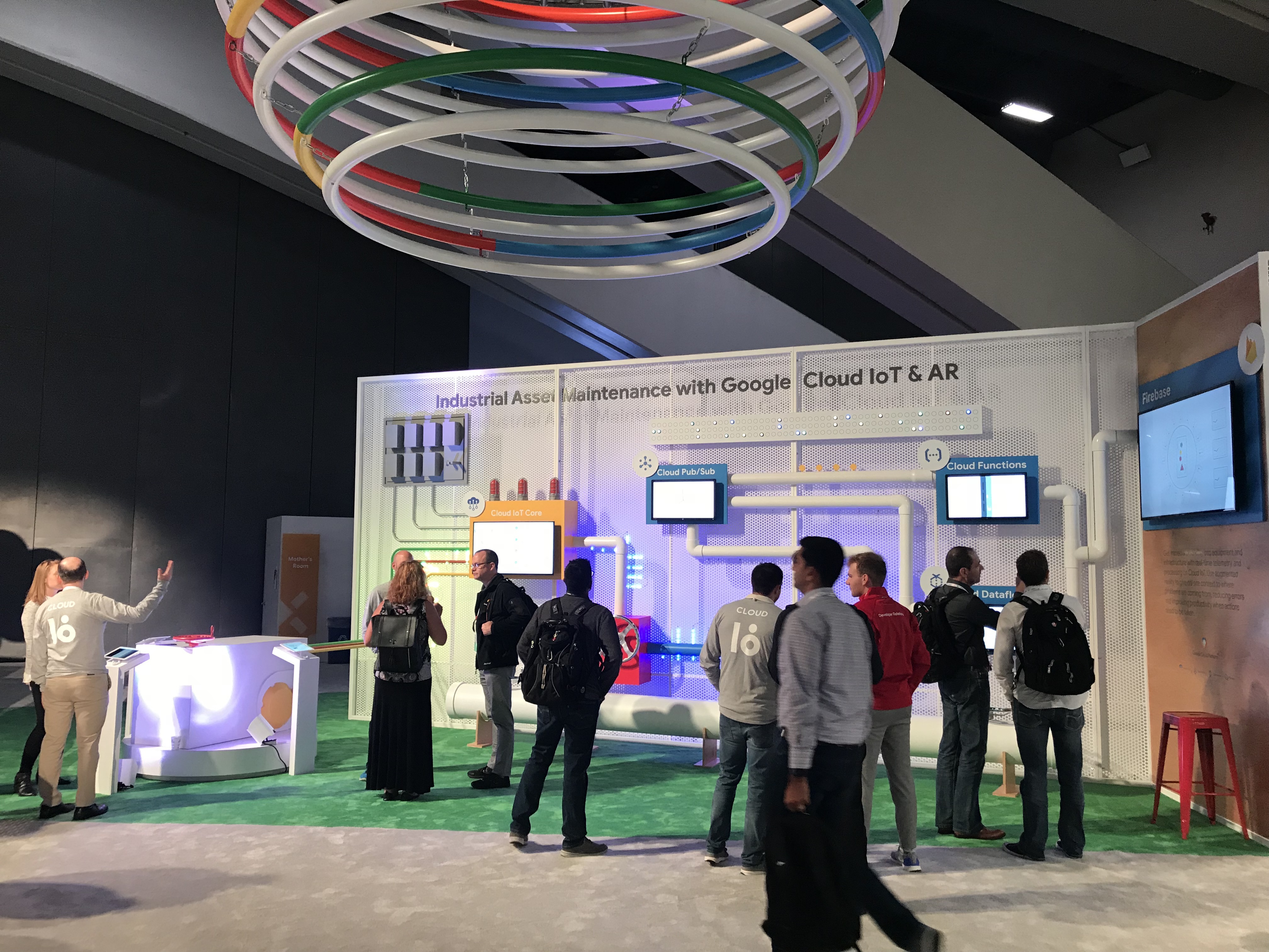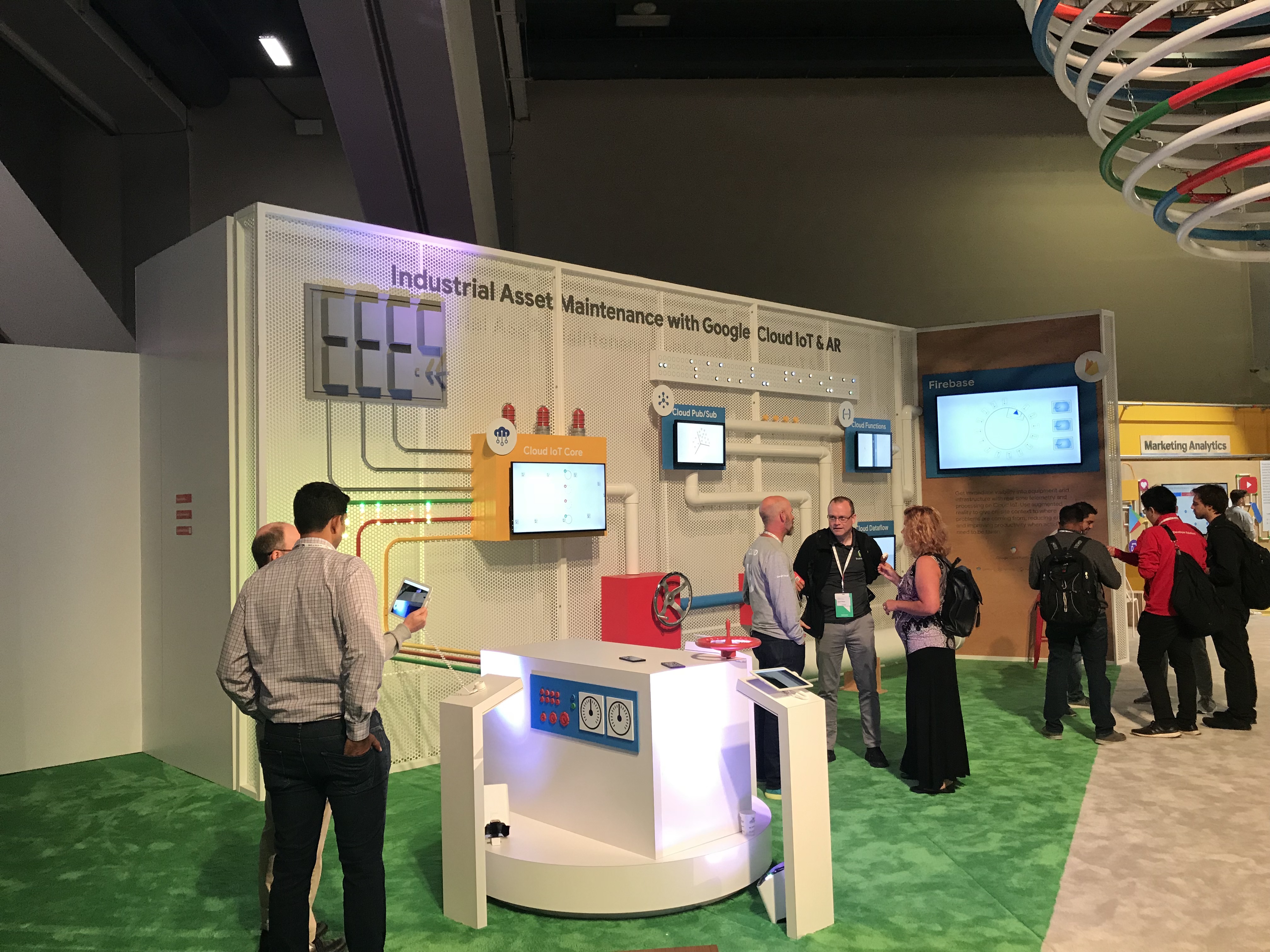 The AR app runs a backend architecture that can be used by any of Google’s customers to build their own maintenance apps. The wall that is part of this installation is a spatial representation of the backend architecture wit each piece animated to represent what happens to data and dat packets at every step.